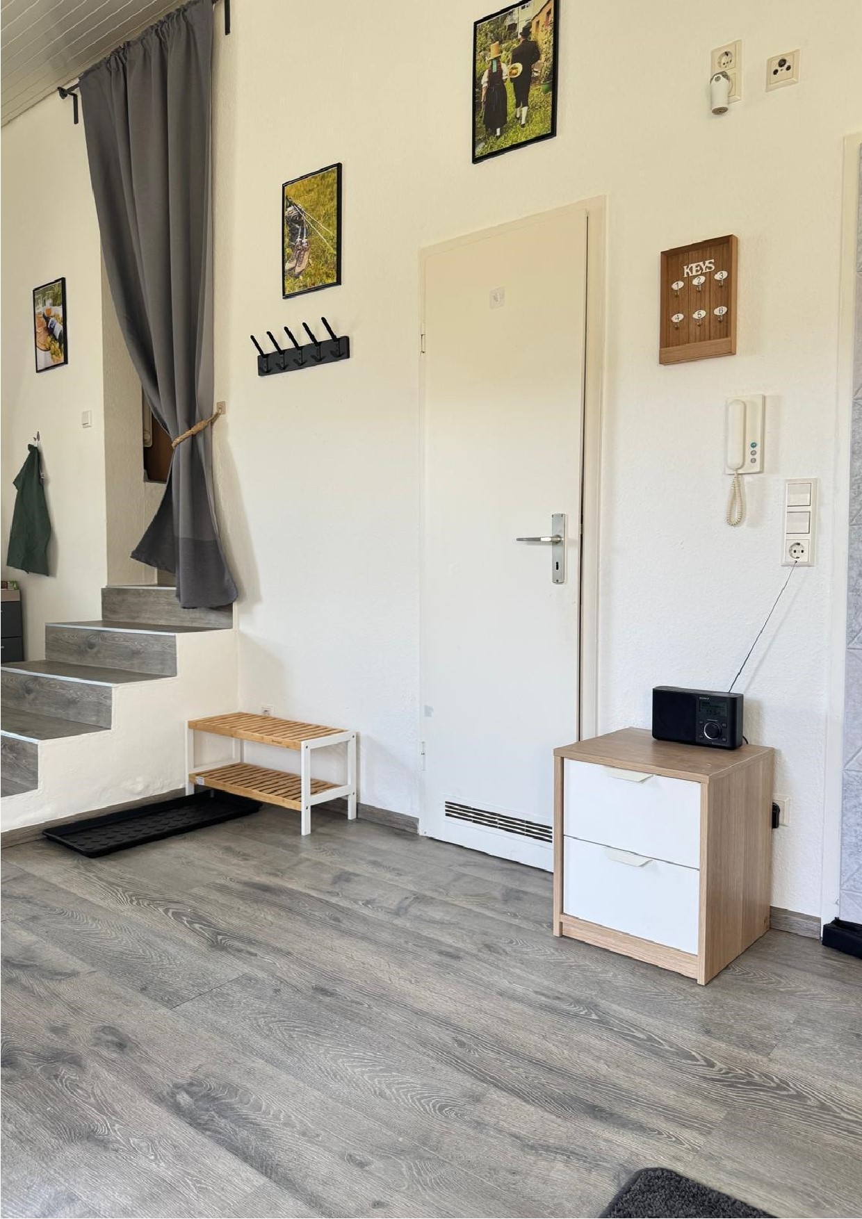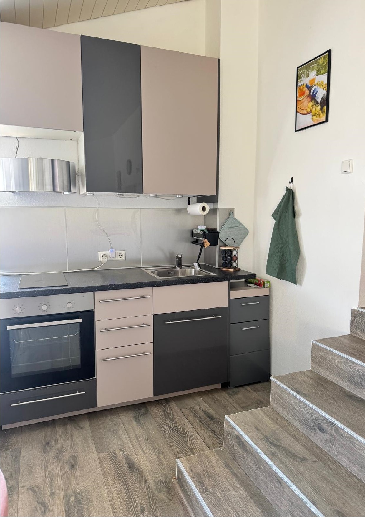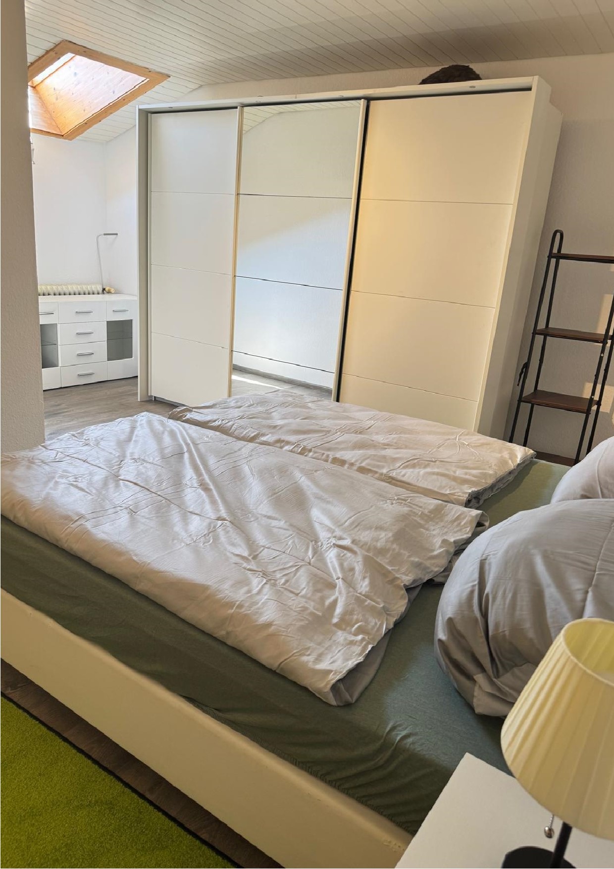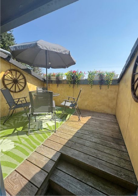 60 qm Ferienfeeling im Dachgeschoss – hell, gemütlich und mit Charme. Ein geräumiges Schlafzimmer für erholsamen Schlaf, ein Badezimmer mit Regenschauerdusche für den Tropenmoment am Morgen, ein Abstellraum für Koffer,