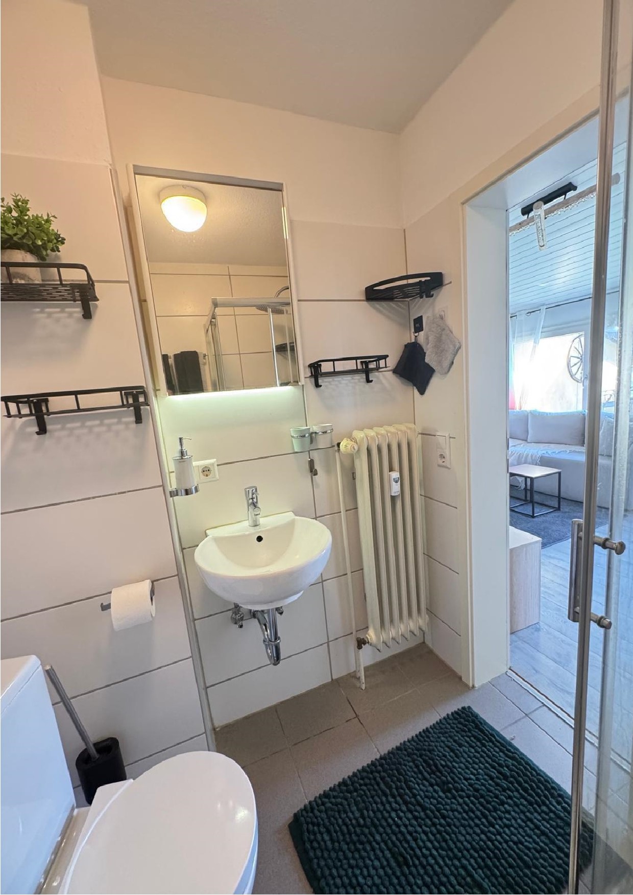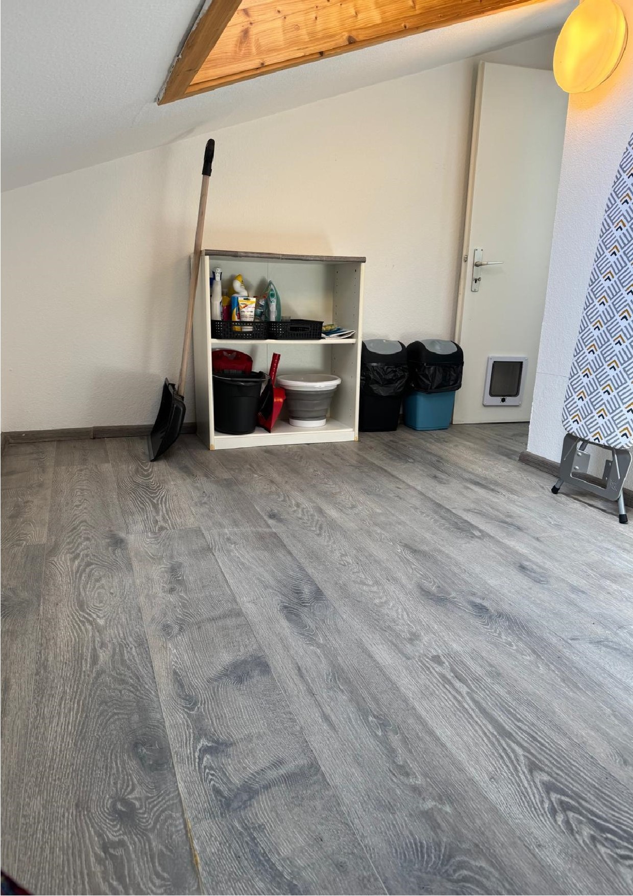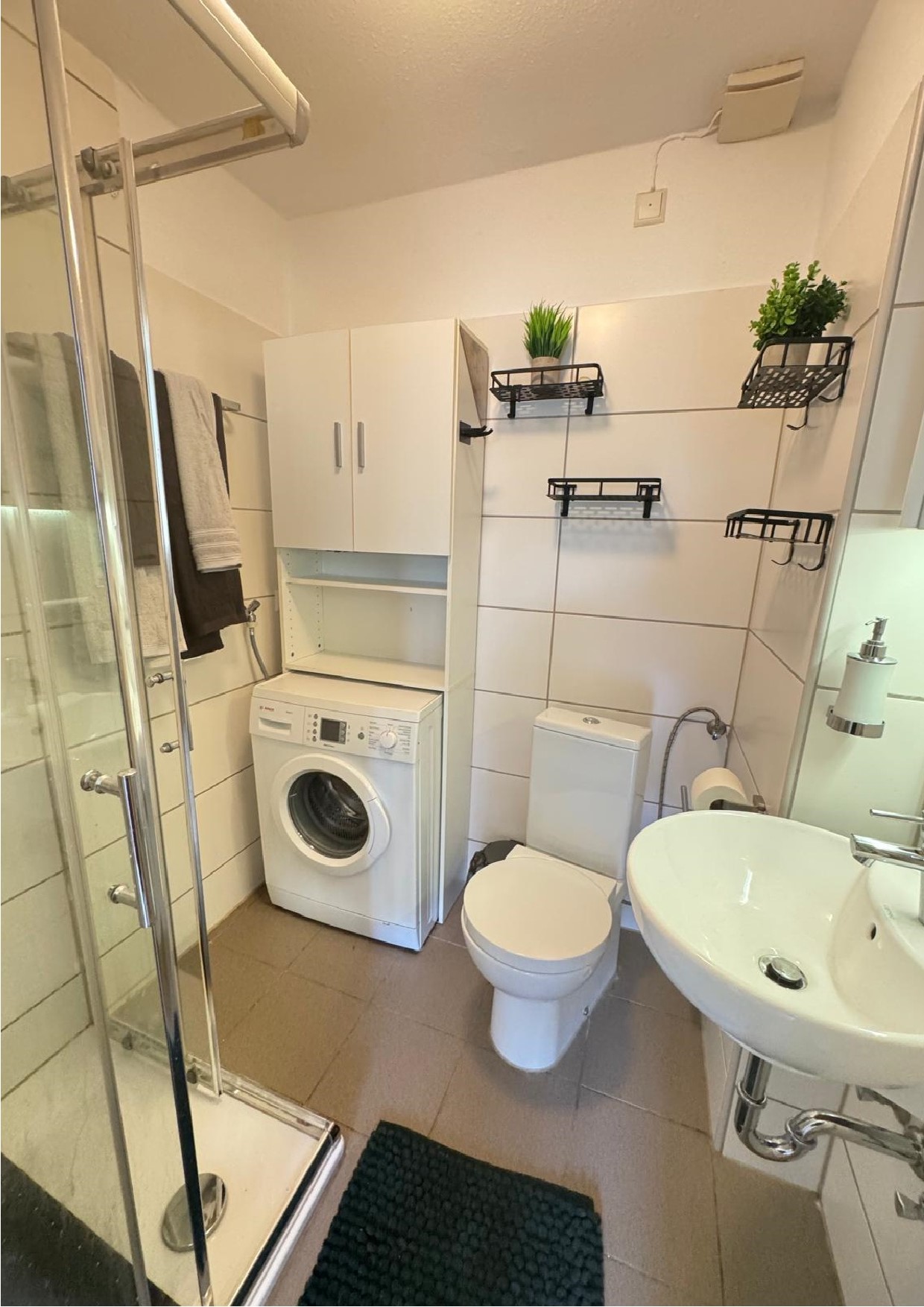 Staubsauger, Nasswischer, Besen und Handfeger, Reinigungsmittel, Bügelbrett und Bügeleisen, Waschmaschine, Wäscheständer mit Wäscheklammern, kleine Essecke, Schlafcouch 140x230 cm, TV mit Amazon Fire TV-Stick, W-Lan, kleine Sitzgruppe mit Sonnenschirm auf der Terrasse, Elektrogrill